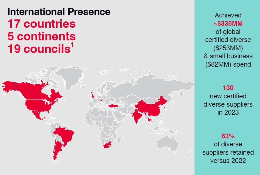 We believe an inclusive, diverse and equitable supplier base not only benefits our business, but also the communities where we operate. We offer supplier training and development programs, mentorship opportunities, events and networking opportunities for diverse suppliers. Our goal is to achieve $500 million in global diverse supplier spend by 2025.